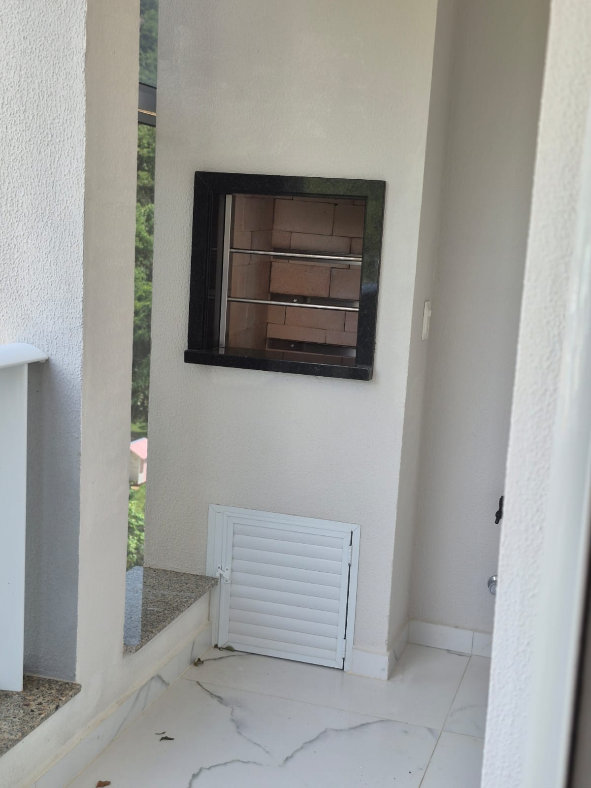 Sacada com churrasqueira a carvão, prédio com elevador, salão de festas, garagem coberta.